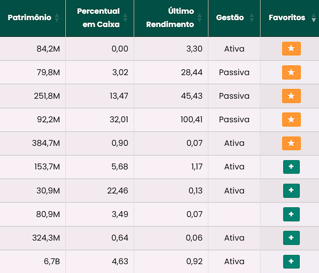 | Ticker | Preço | P/VP | Valorização | DY | Liquidez Diária | Liquidez Média Mensal | Dividendos CAGR 3 Anos | Valor CAGR 3 Anos | Patrimônio | Percentual em Caixa | Último Rendimento | Gestão | Adicionar ao Portfólio |
