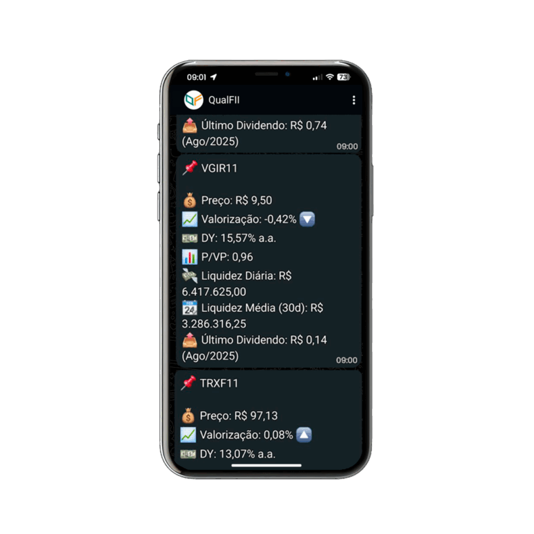 Uso o QualFII para triagem rápida: combino filtros, salvo listas e acompanho tudo no meu portfólio. As notificações por e-mail/WhatsApp me avisam de movimentos relevantes sem eu precisar acessar a Internet.
